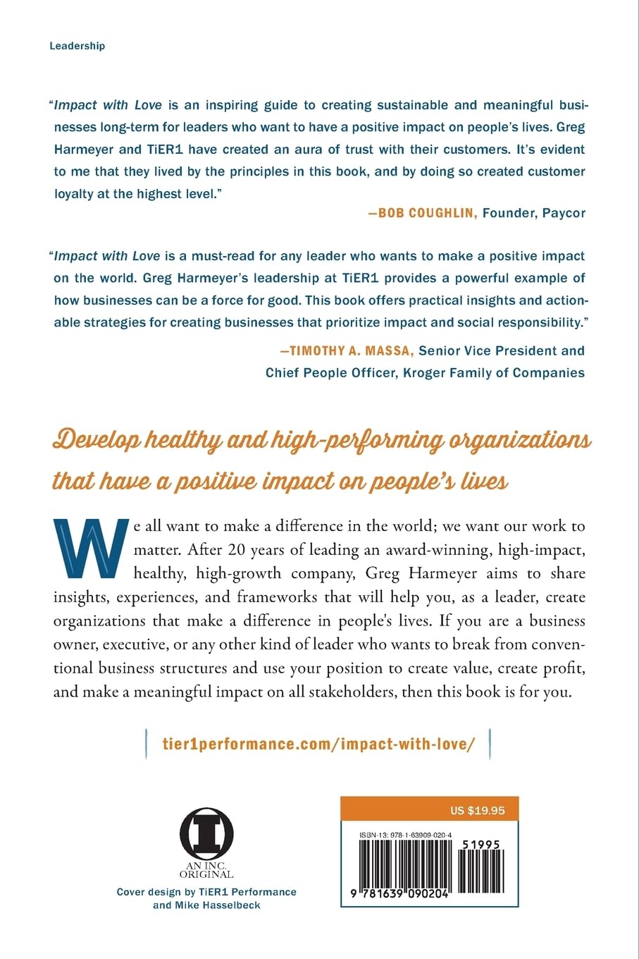Impact with Love is an Amazon Bestseller in Business Leadership and is based on TiER1 Impact CEO Greg Harmeyer’s 20 years of experience in leading an award-winning, healthy, high-growth company. He wrote the book for leaders who want to use their position of influence to build healthier, high-performing, people-centered organizations.