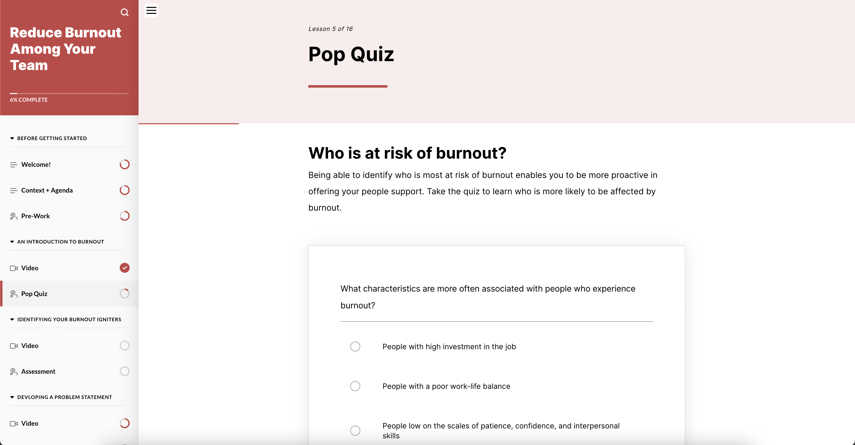 In Reducing Burnout Among Your Team, you’ll explore the science behind burnout, learn the five root causes or “igniters” of burnout, and gain tools for your team to identify and mitigate the impact of these burnout igniters in their work. This course features videos, self-assessments, and activities to guide your learning.
