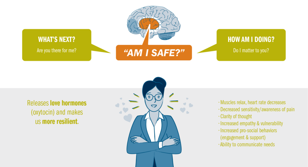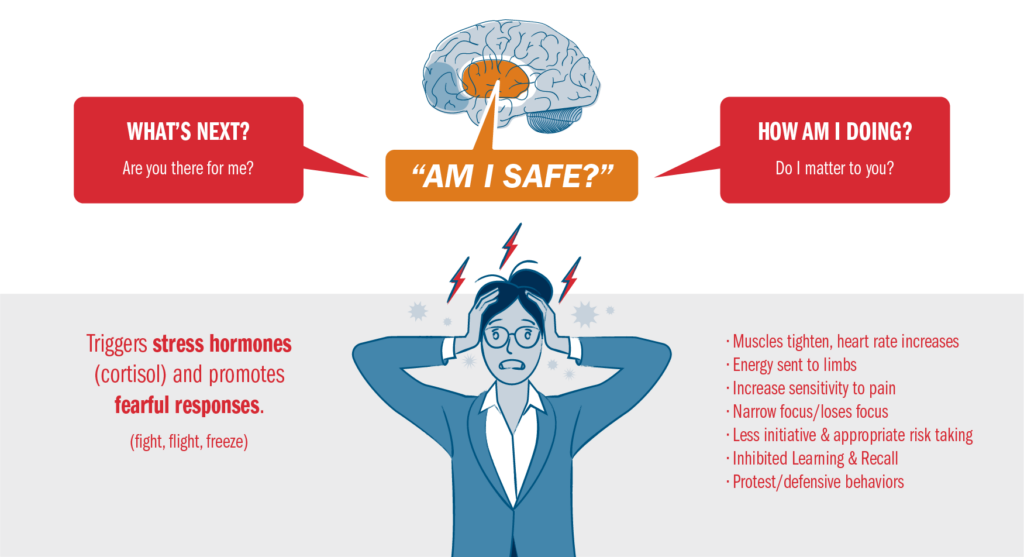 Therefore, if your team members (based on their past experiences) don’t feel instinctively safe, they will always revert to the behavior they’ve learned as protective strategies to maintain equilibrium. In this space you will not find creativity, innovation, or the initiative to take on new responsibilities because the brain is spending A LOT of extra resources trying to manage their internal experience.