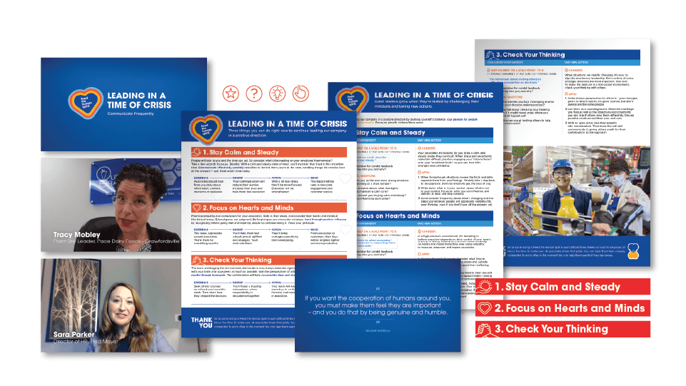Our consultants partnered with the Kroger team to create several resources on Leading in a Time of Crisis that spring, including five 2-minute videos and two handouts. These resources were shared with all people leaders across the organization to help them lead through the COVID-19 crisis. The videos were intended to demystify how strong leaders lead others through crisis and included clips of various levels of Kroger leaders sharing how they have struggled with and developed critical behaviors during tough times. Meanwhile, the handouts offered tips on how to lead appropriately despite the stress leaders are facing, including communicating in crisis times; managing with grace even when it’s difficult; and advice for slowing down, being thoughtful, and making good decisions. These assets helped Kroger leaders recognize their own leadership styles and norms and to develop their emotional intelligence muscles so they could continue to lead the company in a positive direction.