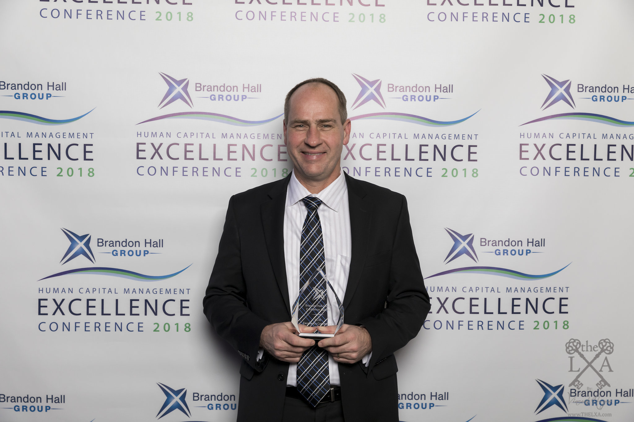 TiER1’s CEO Greg Harmeyer accepts the Brandon Hall Group Excellence in Technology Award. Photography by The LXA Inc.